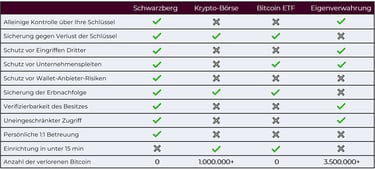 Die mit Bitcoin verbundenen Risiken sind meist auf zentrale Anbieter wie Börsen oder ETFs zurückzuführen, nicht auf Bitcoin selbst. Ohne den Besitz der privaten Schlüssel vertraut man lediglich auf das Garantieversprechen des Anbieters, jederzeit den vollen Zugriff auf die eigenen Bitcoin zu erhalten.